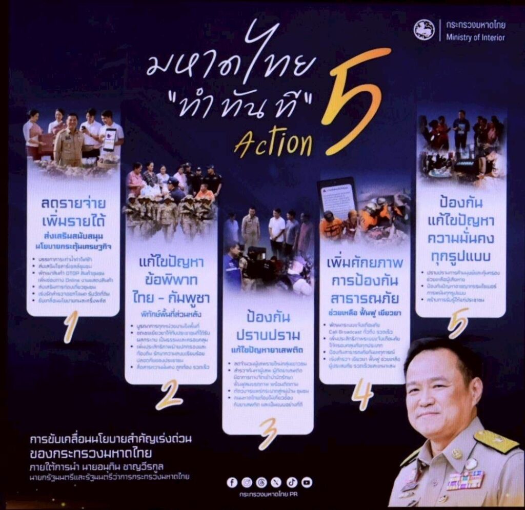 การประชุมครั้งนี้มีการติดตามและขับเคลื่อนนโยบายสำคัญของกระทรวงมหาดไทย โดยเฉพาะนโยบายเร่งด่วน “มหาดไทย ทำ ทัน ที Action 5” ที่มุ่งเน้นการลดรายจ่าย เพิ่มรายได้ และสนับสนุนมาตรการกระตุ้นเศรษฐกิจ รวมถึงการป้องกันและปราบปรามยาเสพติด การเพิ่มศักยภาพการป้องกันและบรรเทาสาธารณภัย ตลอดจนการดูแลความมั่นคงในทุกรูปแบบ