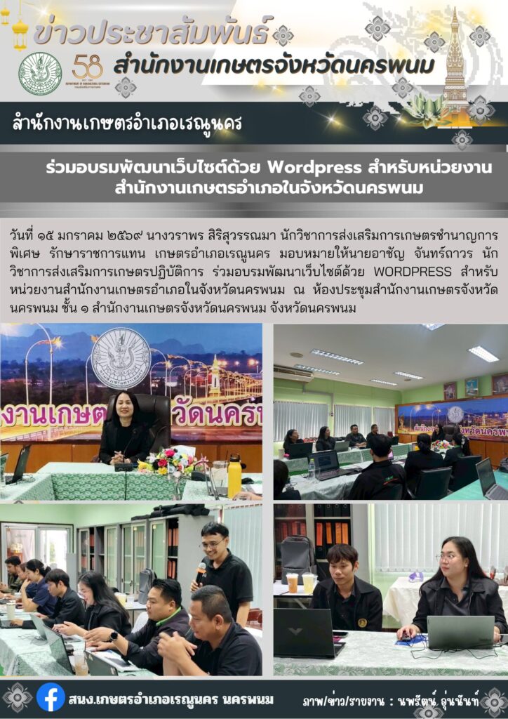 ร่วมอบรมพัฒนาเว็บไซต์ด้วย WordPress สำหรับหน่วยงานสำนักงานเกษตรอำเภอในจังหวัดนครพนมBy admin_renu / 21 มกราคม 2026