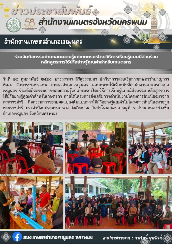 ร่วมจัดกิจกรรมถ่ายทอดความรู้แก่เกษตรกรโดยวิธีการเรียนรู้แบบมีส่วนร่วมหลักสูตรการใช้น้ำอย่างรู้คุณค่าสำหรับเกษตรกรBy admin_renu / 25 กุมภาพันธ์ 2026