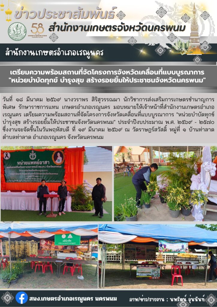 เตรียมความพร้อมสถานที่จัดโครงการจังหวัดเคลื่อนที่แบบบูรณาการ “หน่วยบำบัดทุกข์ บำรุงสุข สร้างรอยยิ้มให้ประชาชนจังหวัดนครพนม”By admin_renu / 19 มีนาคม 2026