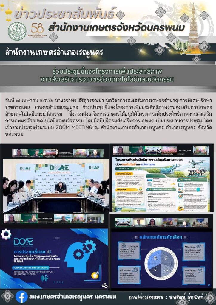 ร่วมประชุมชี้แจงโครงการเพิ่มประสิทธิภาพงานส่งเสริมการเกษตรด้วยเทคโนโลยีและนวัตกรรมBy admin_renu / 8 เมษายน 2026