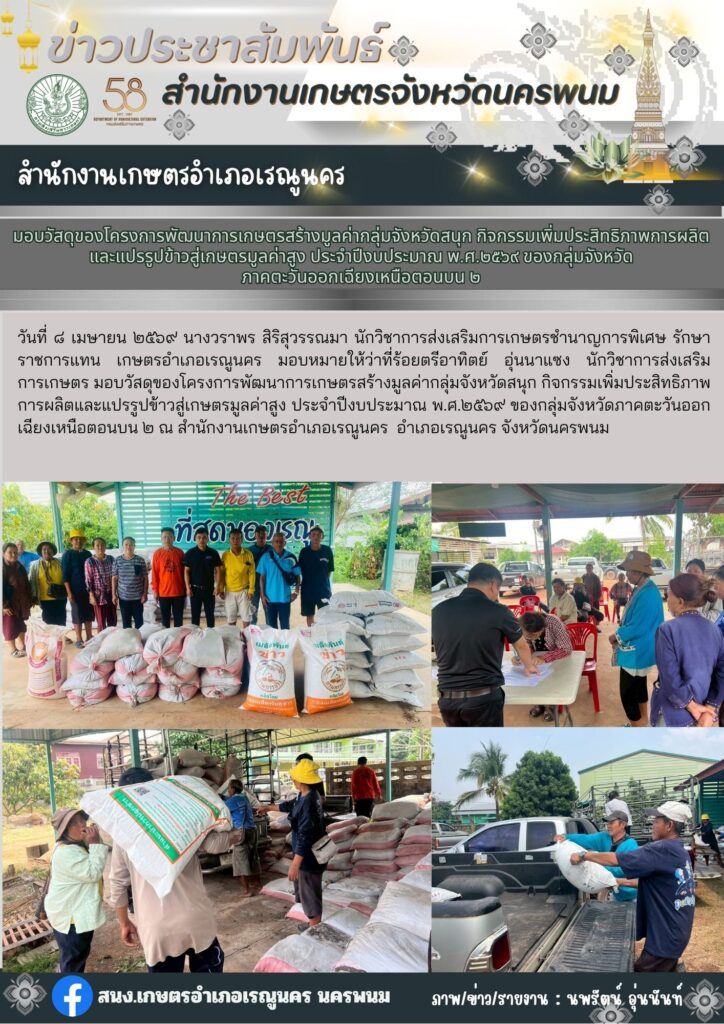 มอบวัสดุของโครงการพัฒนาเกษตรสร้างมูลค่ากลุ่มจังหวัดสนุก กิจกรรมเพิ่มประสิทธิภาพการผลิตและแปรรูปข้าวสู่เกษตรมูลค่าสูง ประจำปีงบประมาณ พ.ศ. ๒๕๖๙ ของกลุ่มจังหวัดภาคตะวันออกเฉียงเหนือตอนบน ๒By admin_renu / 10 เมษายน 2026