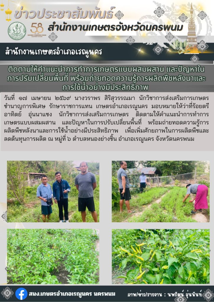 ติดตามให้คำแนะนำการทำการเกษตรแบบผสมผสาน และปัญหาในการปรับเปลี่ยนพื้นที่ พร้อมถ่ายทอดความรู้การผลิตพืชหลังนาและการใช้น้ำอย่างมีประสิทธิภาพ