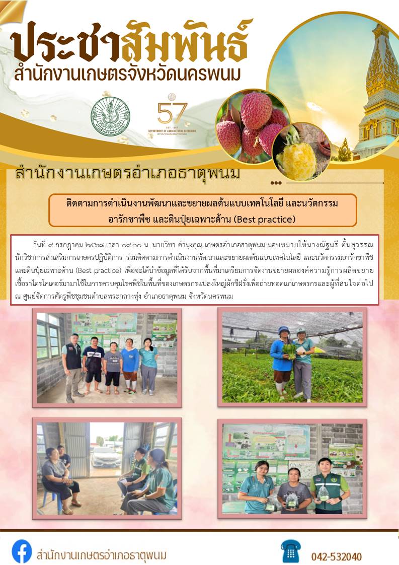 ติดตามการดำเนินงานพัฒนาและขยายผลต้นแบบเทคโนโลยีและนวัตกรรม อารักขาพืช และดินปุ๋ยเฉพาะด้าน (Best practice)อ่านต่อ