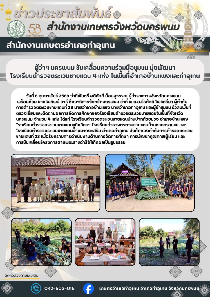 ผู้ว่าฯ นครพนม ขับเคลื่อนความร่วมมือชุมชน มุ่งพัฒนาBy admin_thauthen / 6 กุมภาพันธ์ 2026 โรงเรียนตำรวจตระเวนชายแดน 4 แห่ง ในพื้นที่อำเภอบ้านแพงและท่าอุเทน