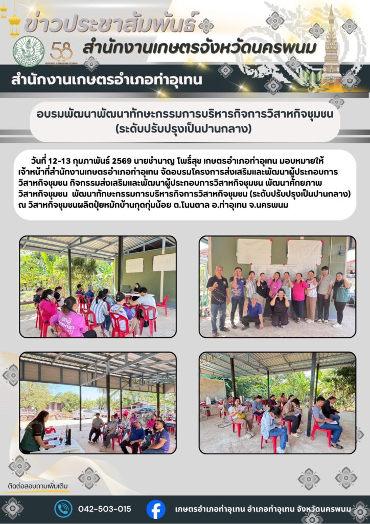 อบรมพัฒนาพัฒนาทักษะกรรมการบริหารกิจการวิสาหกิจชุมชน (ระดับปรับปรุงเป็นปานกลาง)By admin_thauthen / 13 กุมภาพันธ์ 2026